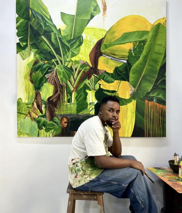 Perpetuating the ancestral techniques of tie and dye it reveals to the artist an incredible wealth of individual expression. Victors’ figures are enticing in their lucidity. The flowers on the skin of the paintings are like tattoo embedded on the black skin which serves as a symbol of identity, sense of reminder of ones origin, communicating the concept of coming from a place where specific plants grow, for the artist it serves as a reminder to his home having lived in a family farm with lots of flowers around him, these flowers are a symbol of nature and beauty, a symbol of love and life. Something to be cherished and cared for. The artists subjects are people around him capturing their essence in his paintings as a symbol of honor to black Identity and African culture.